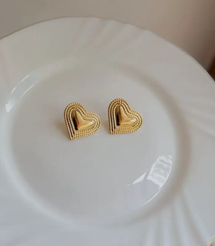 Diseño en forma de corazón que combina un centro dorado brillante con un delicado borde texturizado. Fabricados en acero inoxidable de alta calidad, son la opción ideal para un uso diario duradero, brindando resistencia al desgaste y una elegancia atemporal que complementa cualquier outfit.